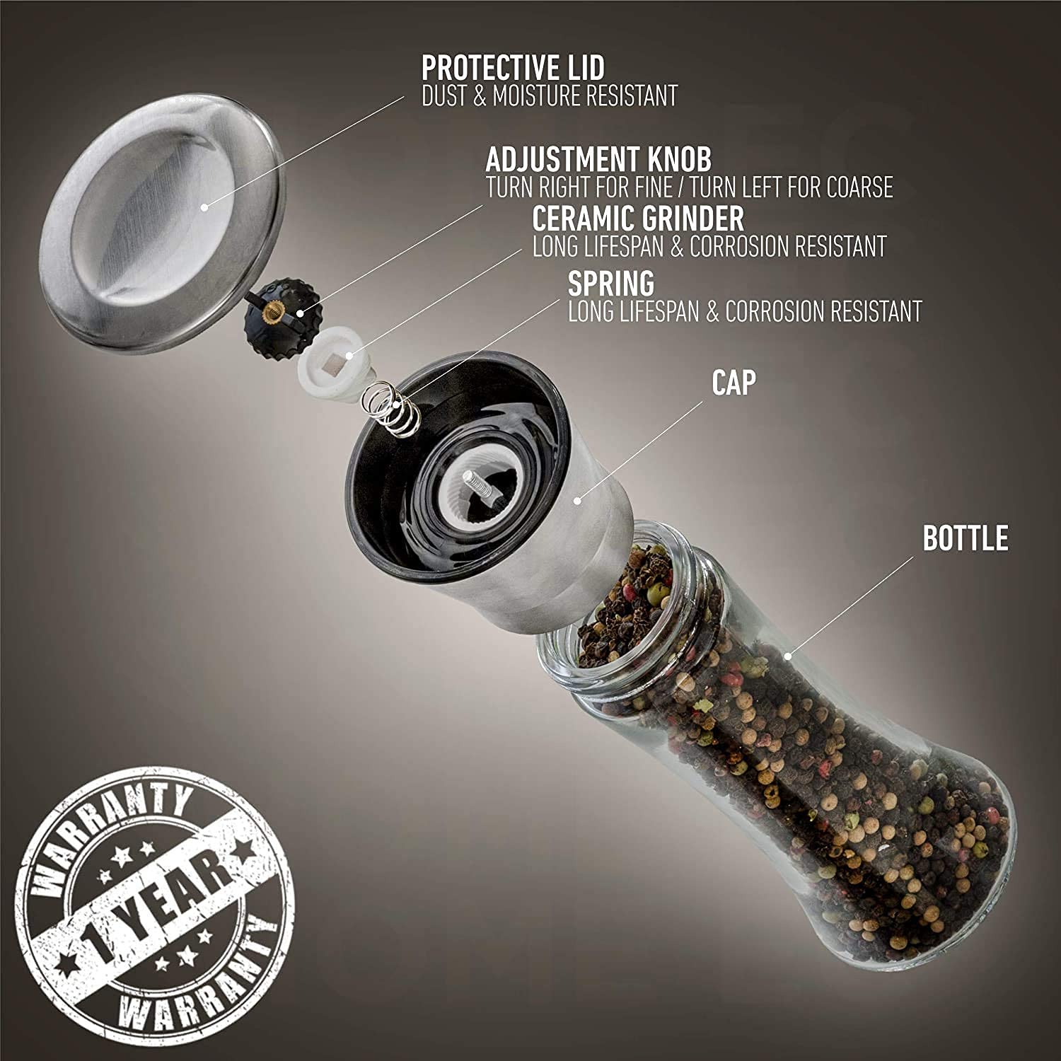 365 DAY GUARANTEE : All our salt mills and pepper mills go through rigorous inspection and testing to ensure our customers receive top quality grinder mills. We are confident you will enjoy our refillable spice grinder sets. In the unlikely event that your set is not to your standards, we will replace it for you, or give you your money back, no hassle!